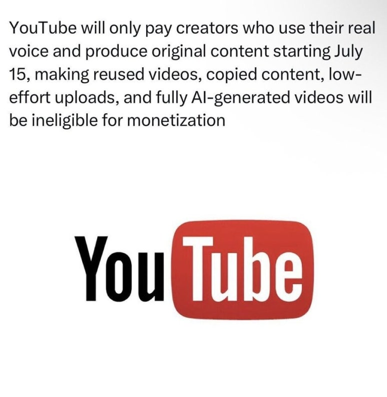재사용된 영상, 복제된 콘텐츠, 낮은 퀄리티의 업로드, 그리고 완전히 AI로 생성된 영상은 수익 창출 자격이 없게 됩니다.